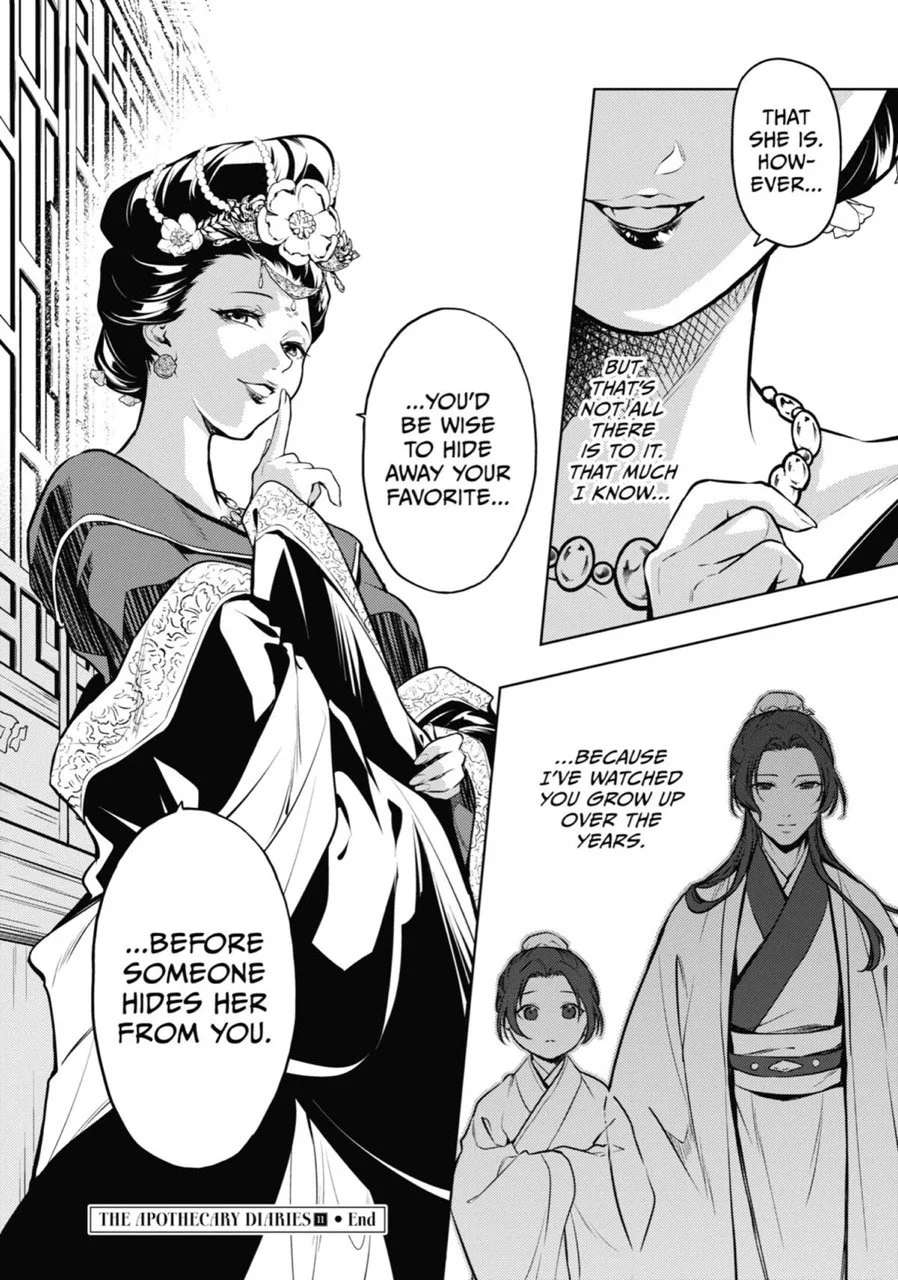 This cliffhanger is frustrating. Some context: back when Maomao and Suiren were going over Jinshi’s childhood toys, there was a mention that any toy Jinshi took a liking to, it’d be taken away. A reminder that he was not allowed to live a normal child’s life. Why that is, I don’t know yet. It explains his psyche of being far too attached to things or people, i.e. Maomao, as if he was afraid of losing them. I seem to recall him, in tears, telling her not to leave him before she went back to the pleasure district. In any case, what does the empress mean by hiding Maomao from him? Like, what does that translate to? And I get that this is meant to keep my interest, to buy the next volume, and it’s frustratingly successful!