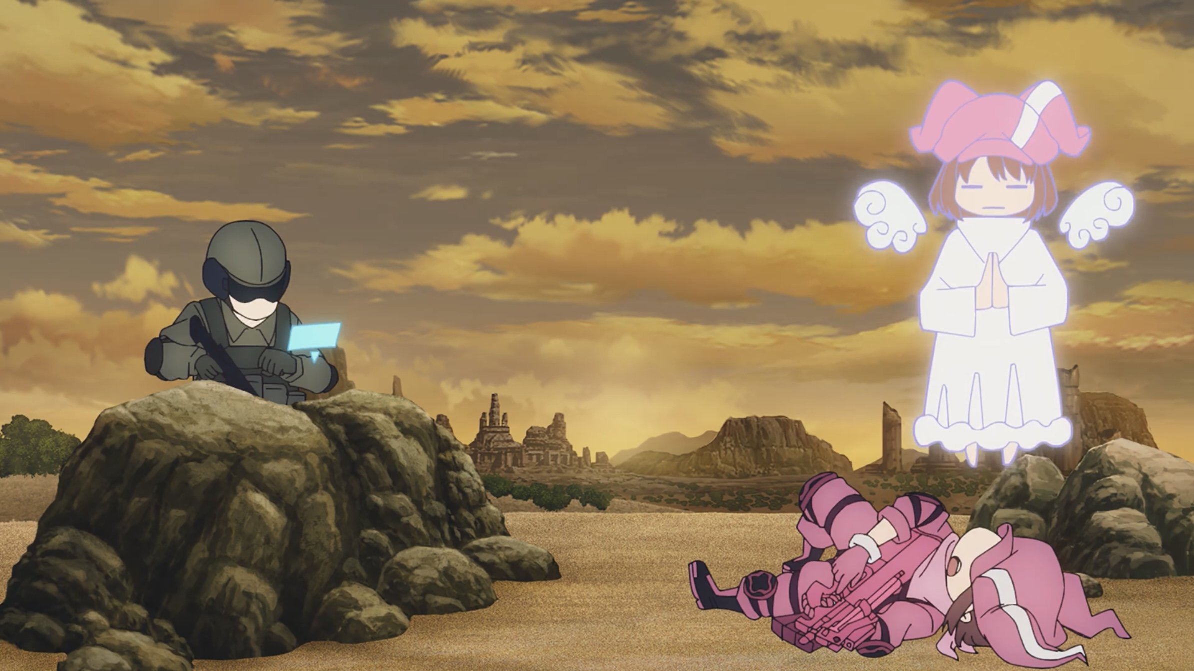 I’ll forego summarizing the latter third of the story, whose ending I found so disappointing as it establishes GGO as a potential rehabilitation system for war veterans. I don’t know where the writer is going with this but I’m skeptical, almost disillusioned at this being the route it’s taking to keep the story fresh. I don’t trust a SAO property to treat this with the nuance it deserves, especially after an oblivious LLENN blurts out “because it’s fun!” to a soldier which she was told was an NPC. And viceversa, as advised by a briefing at the end of an episode.
